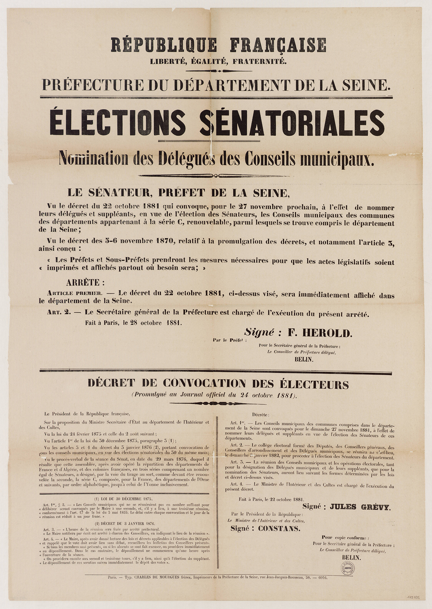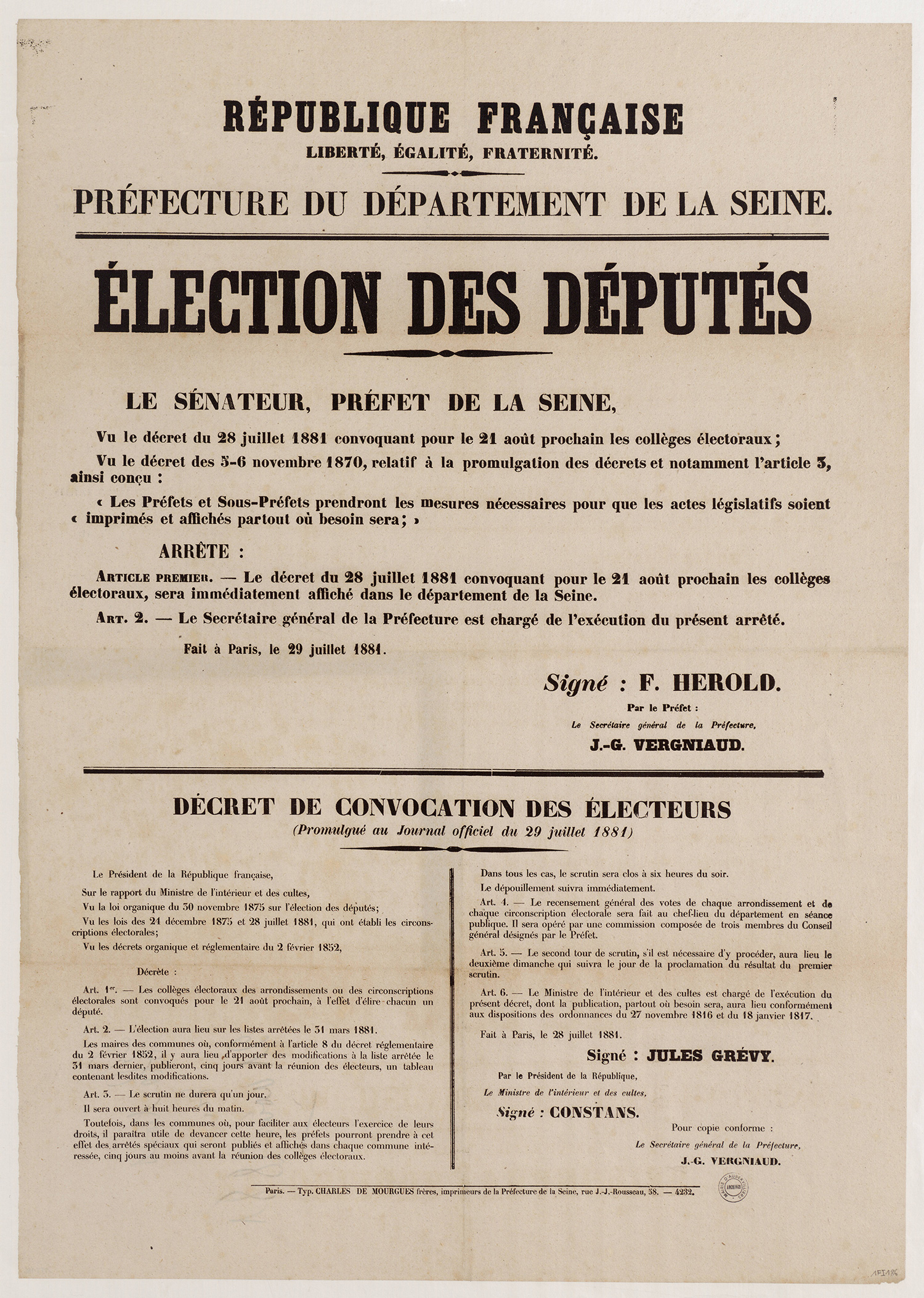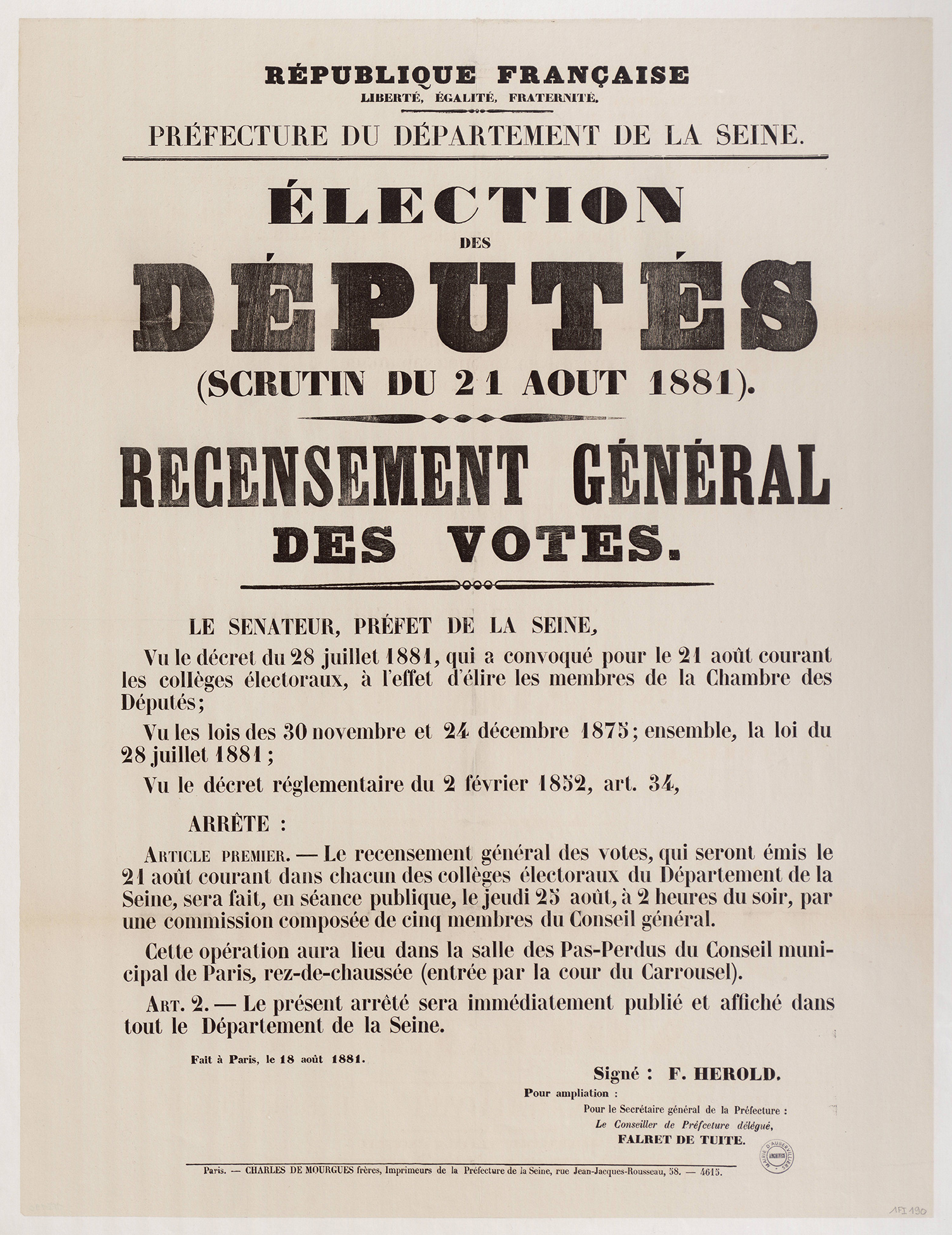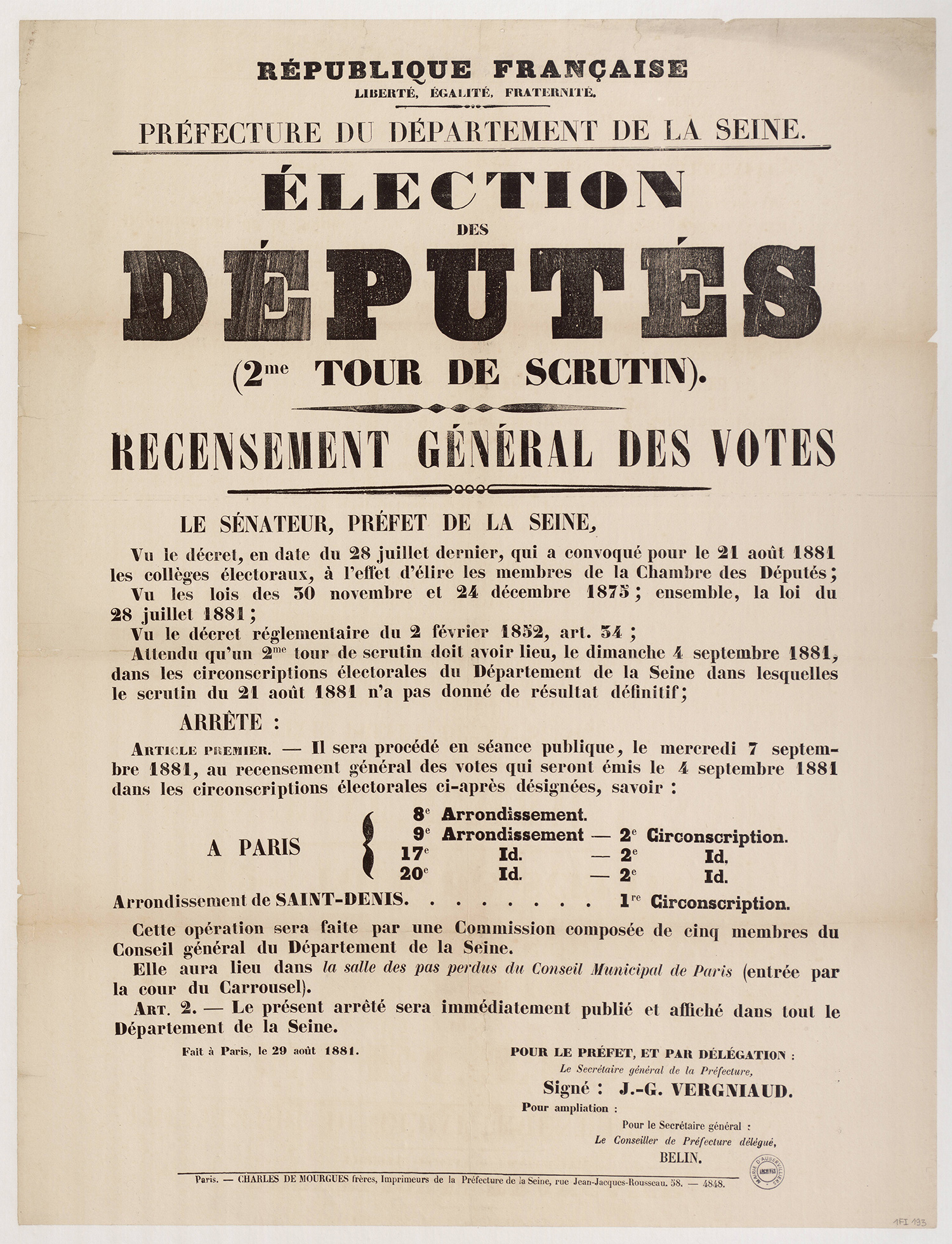 - 1Fi0177 - Publication de décret qui homologue les plans de circonscription, 1880. (format jpg - 966.8 kio - 13/07/2016)