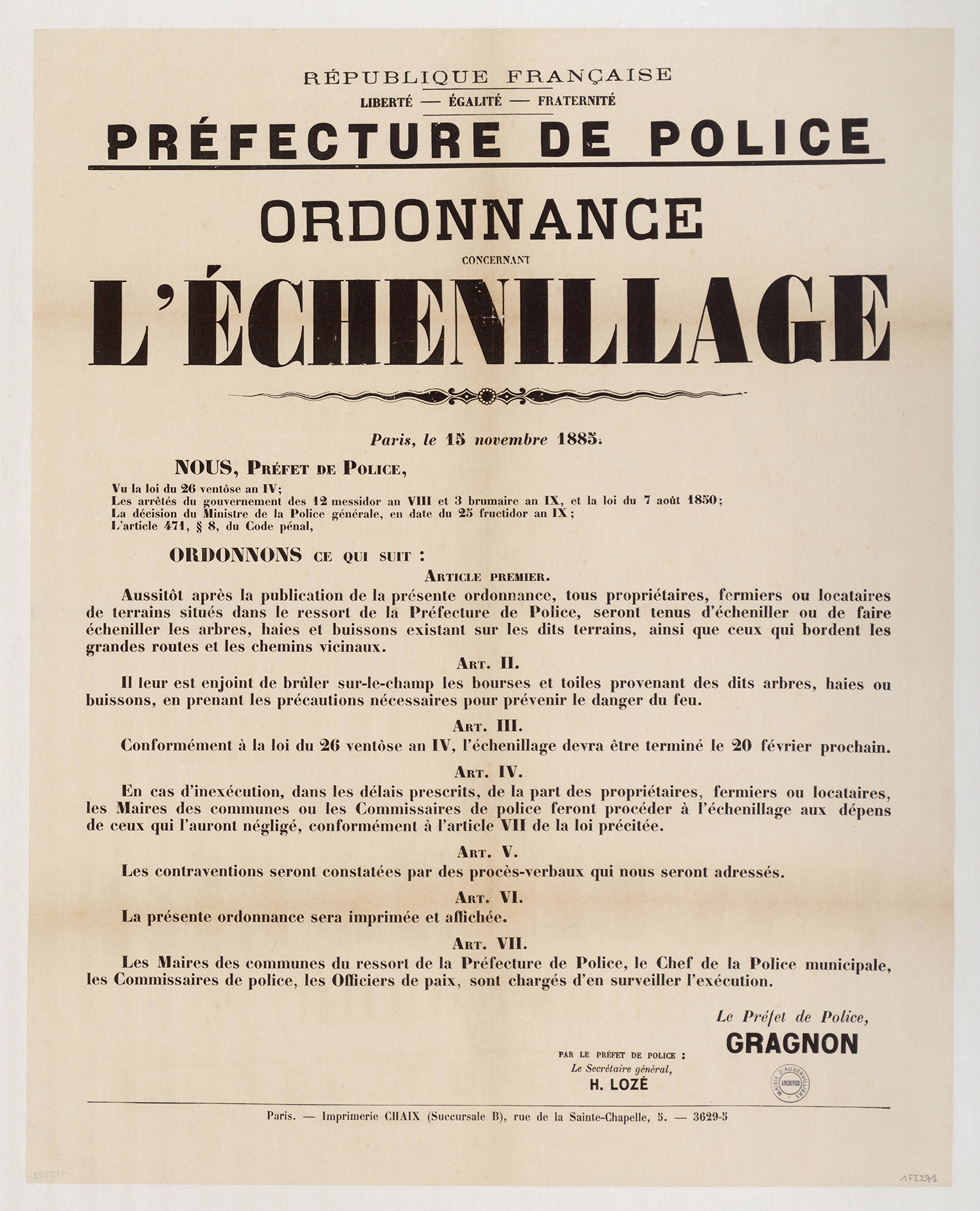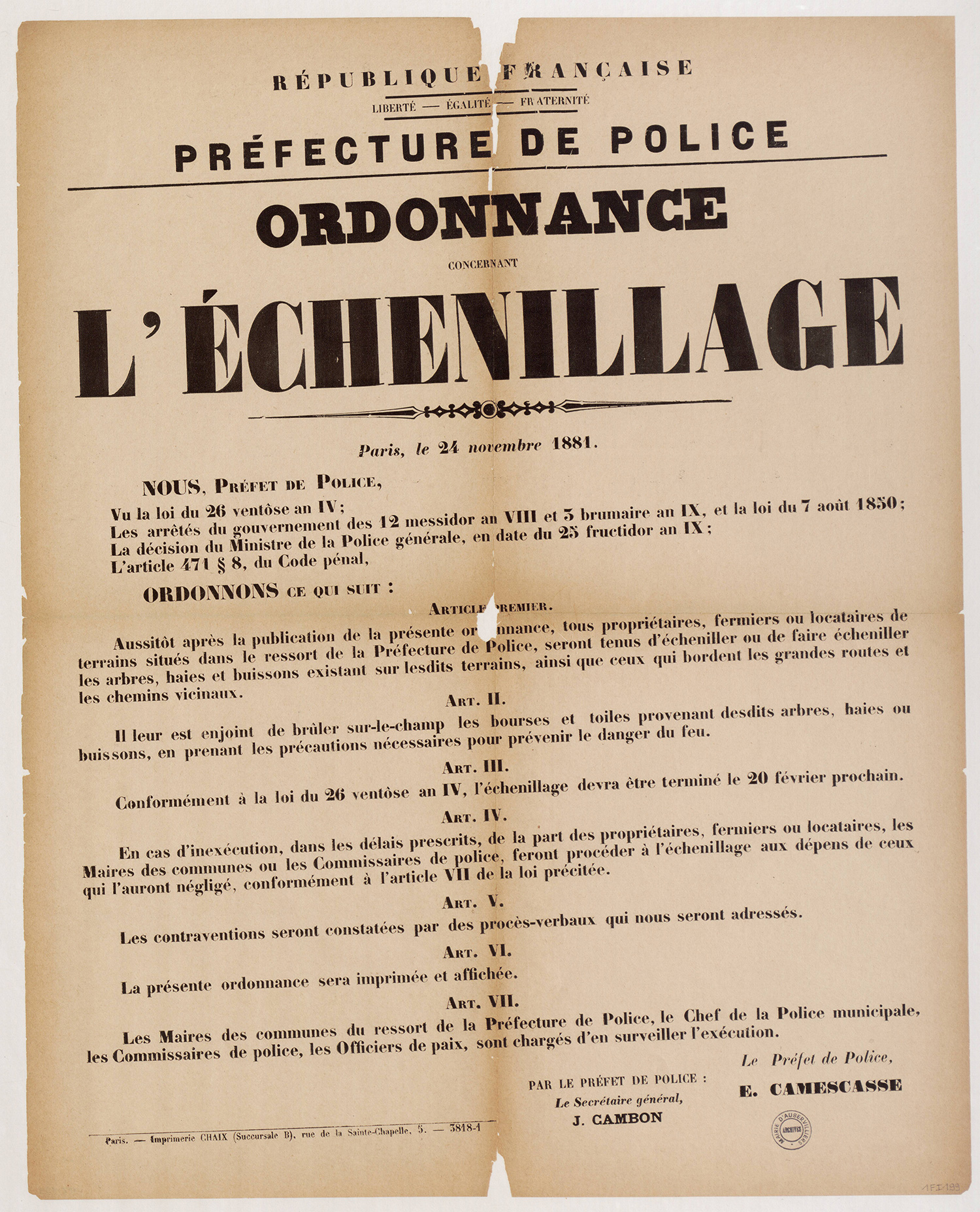 Aubervilliers-Archives municipales - 1Fi0225 - Ordonnance concernant l’échenillage du 28 octobre 1883. (format jpg - 1.4 Mio - 13/07/2016)
