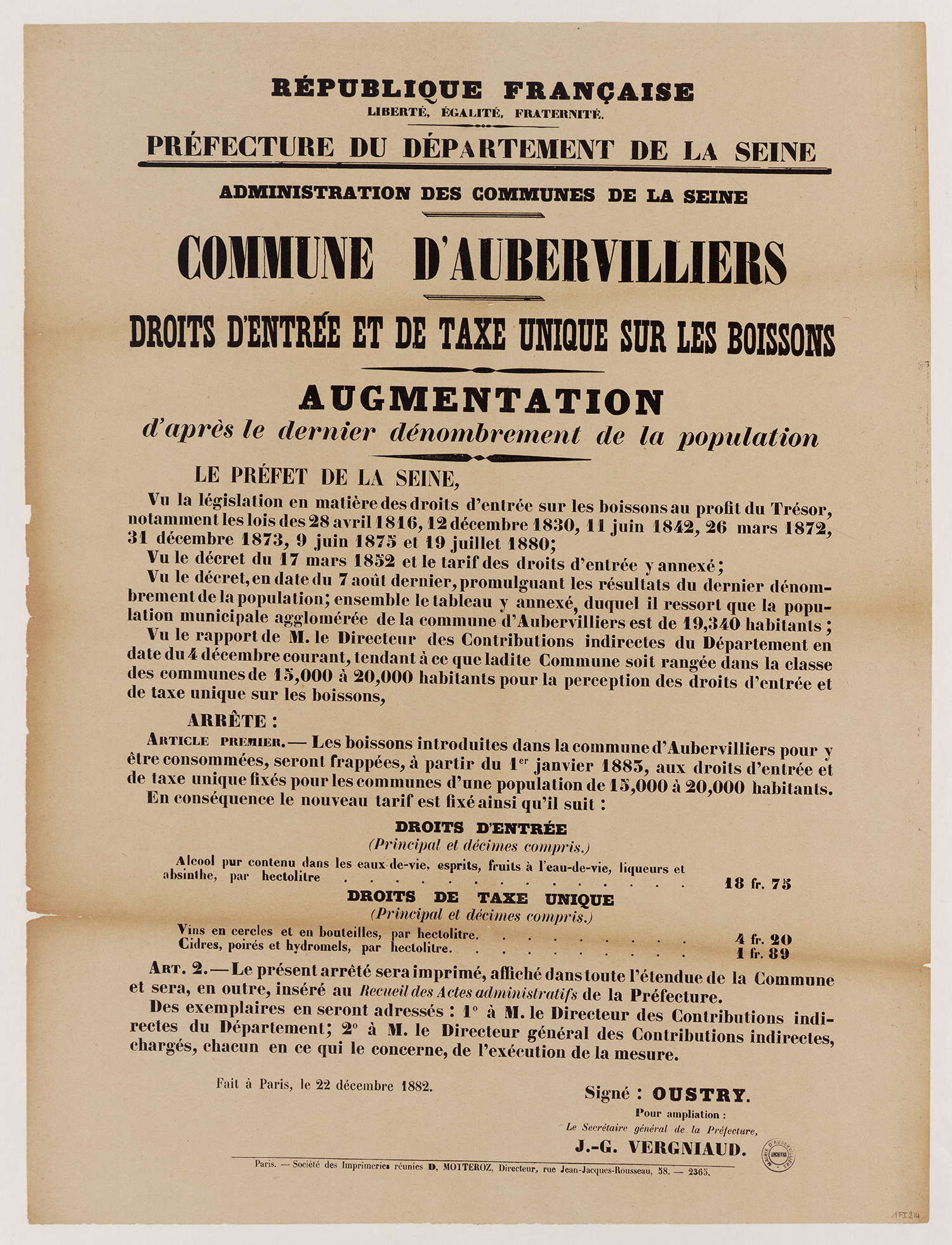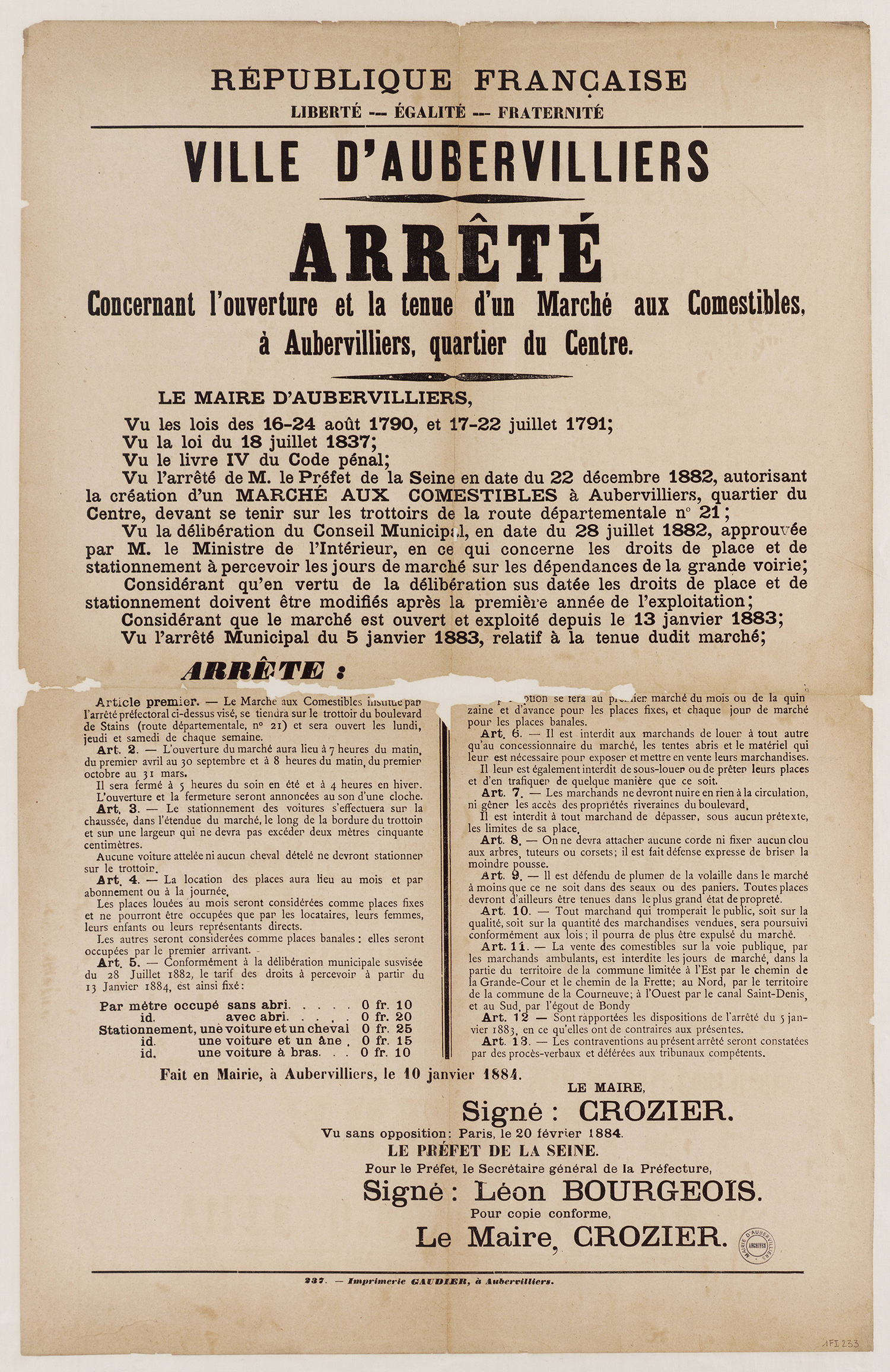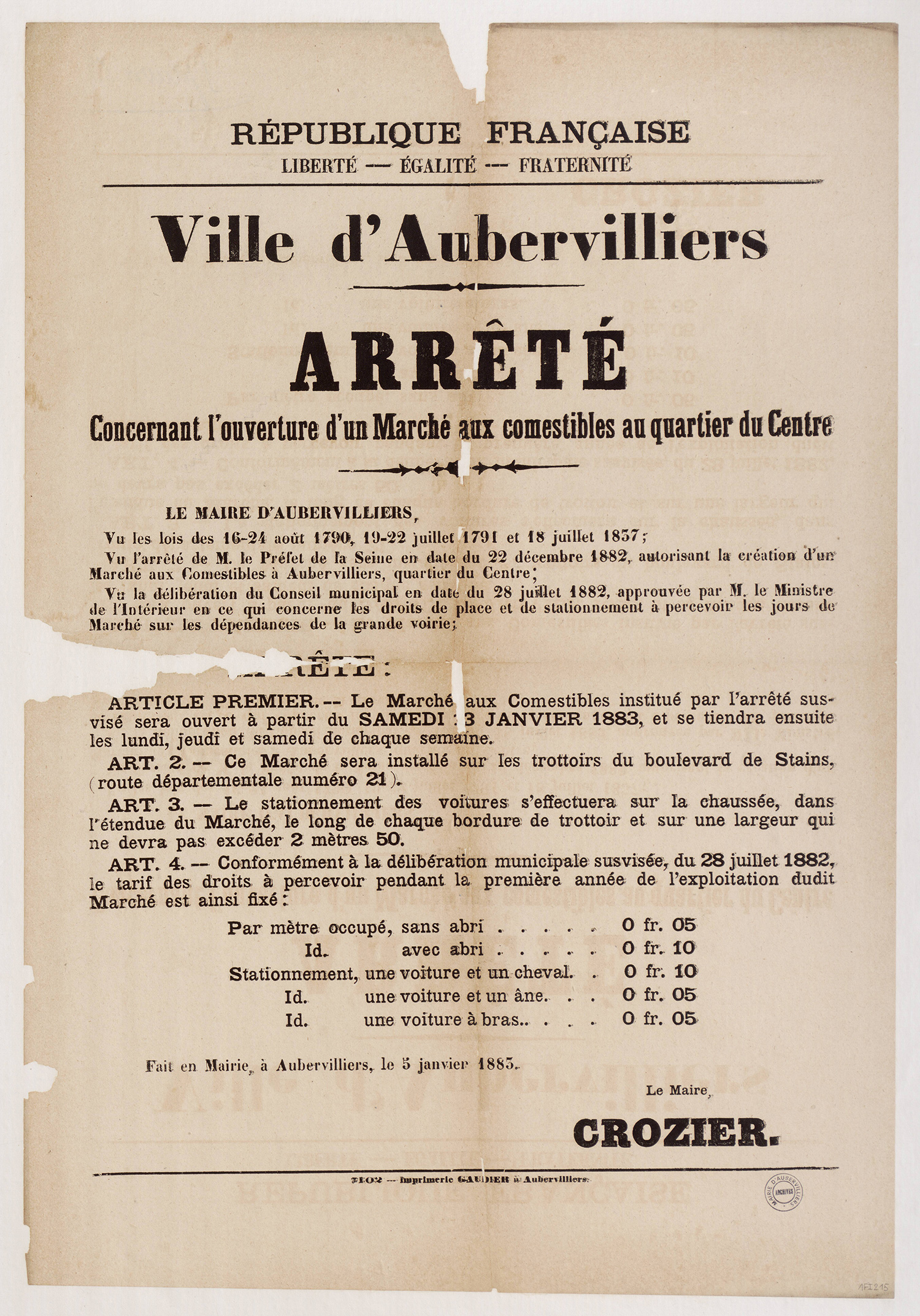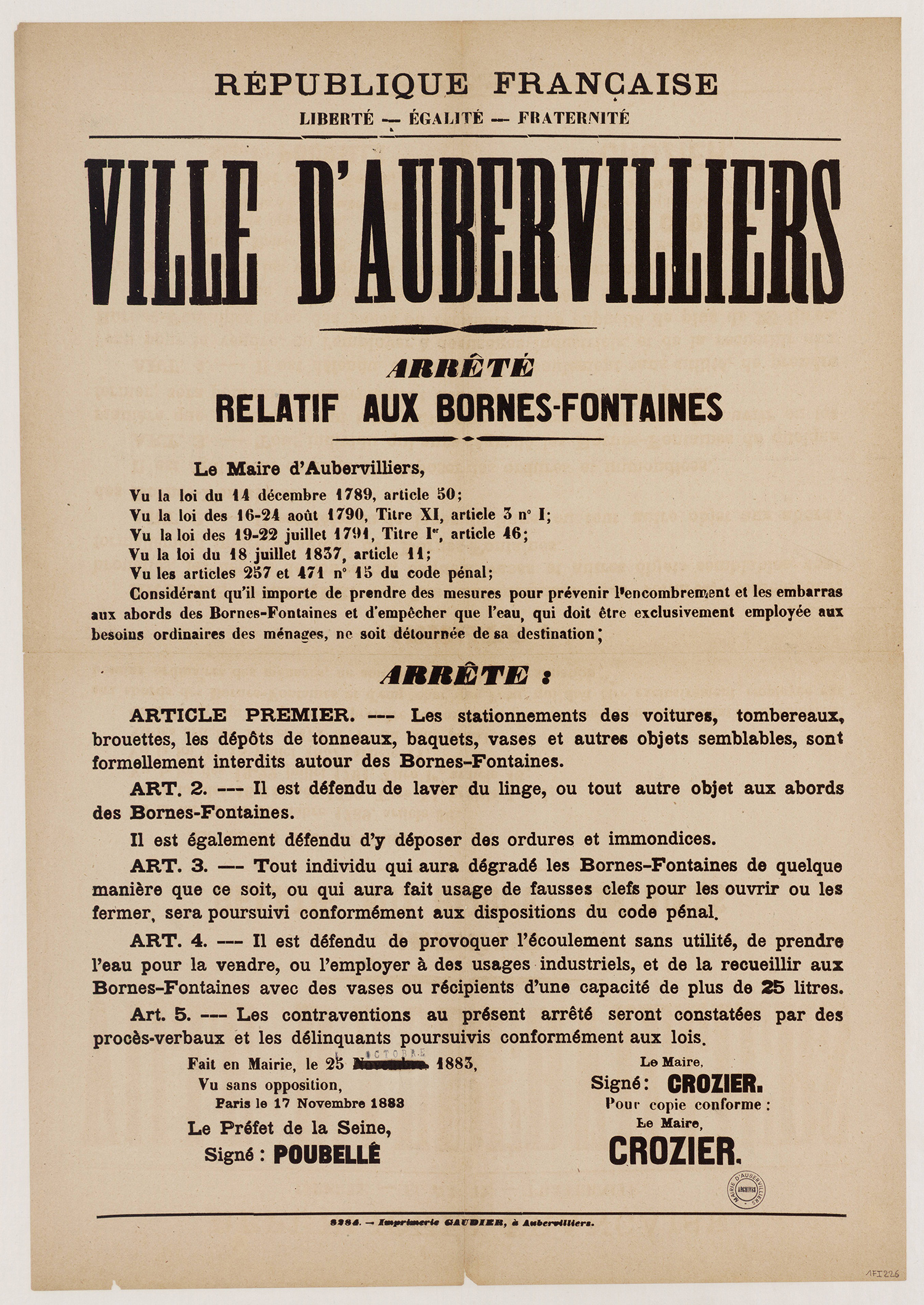 Aubervilliers-Archives municipales - 1Fi0226 - Arrêté du 25 octobre 1883 relatif aux bornes-fontaines, 1883. (format jpg - 1.1 Mio - 13/07/2016)