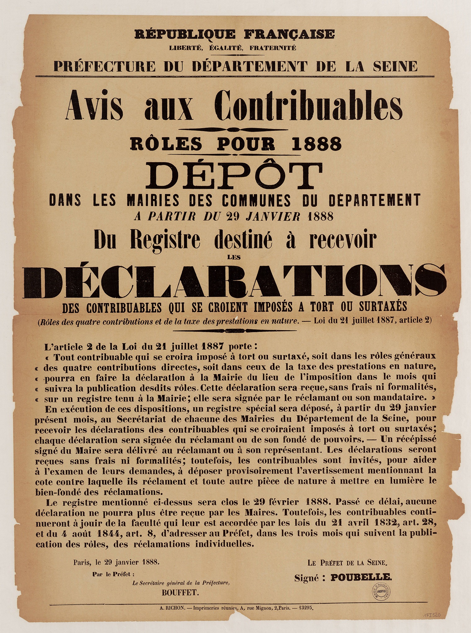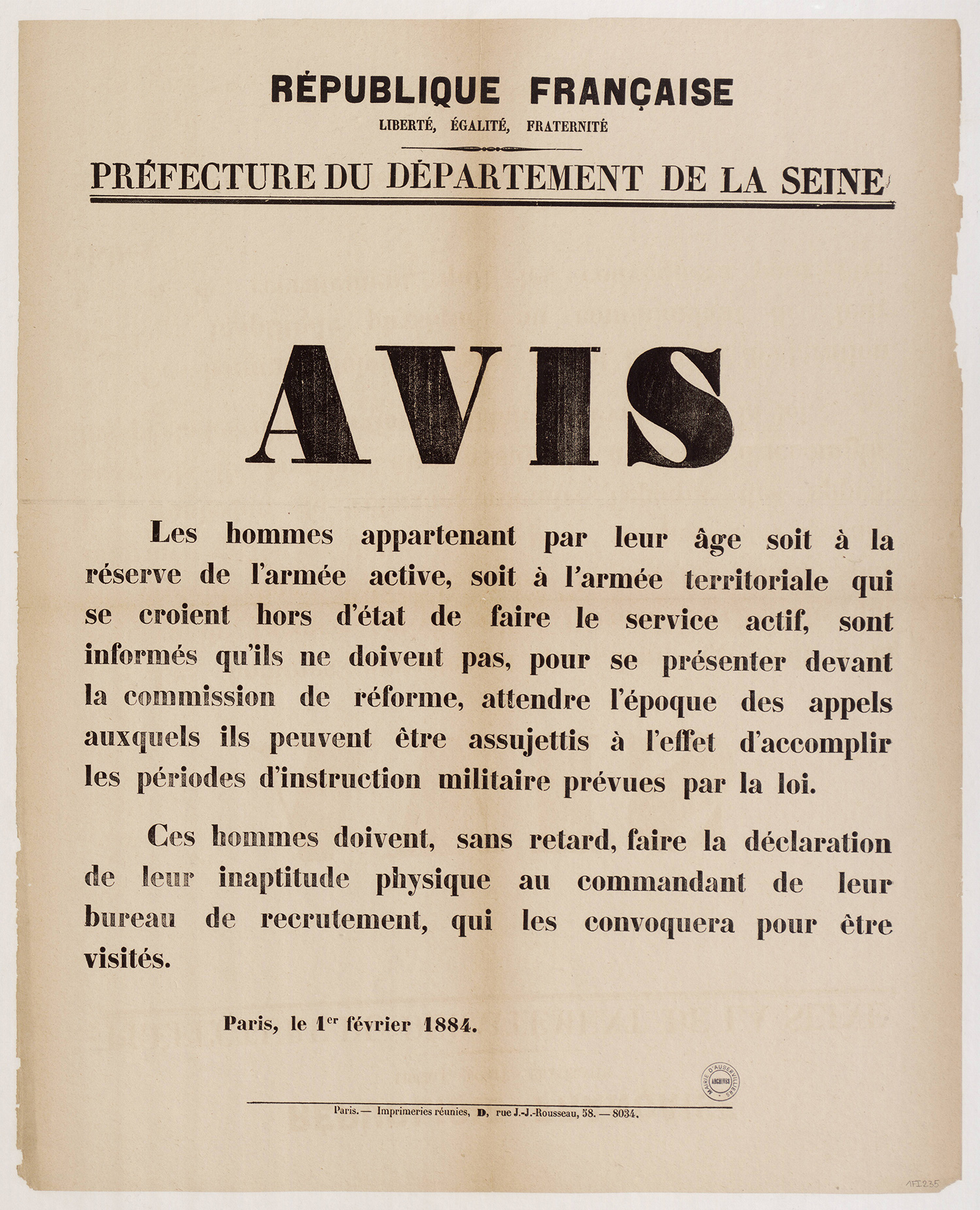 - 1Fi0235 - Avis afin de faire la déclaration rapidement d’inaptitude physique, 1884. (format jpg - 1.6 Mio - 13/07/2016)