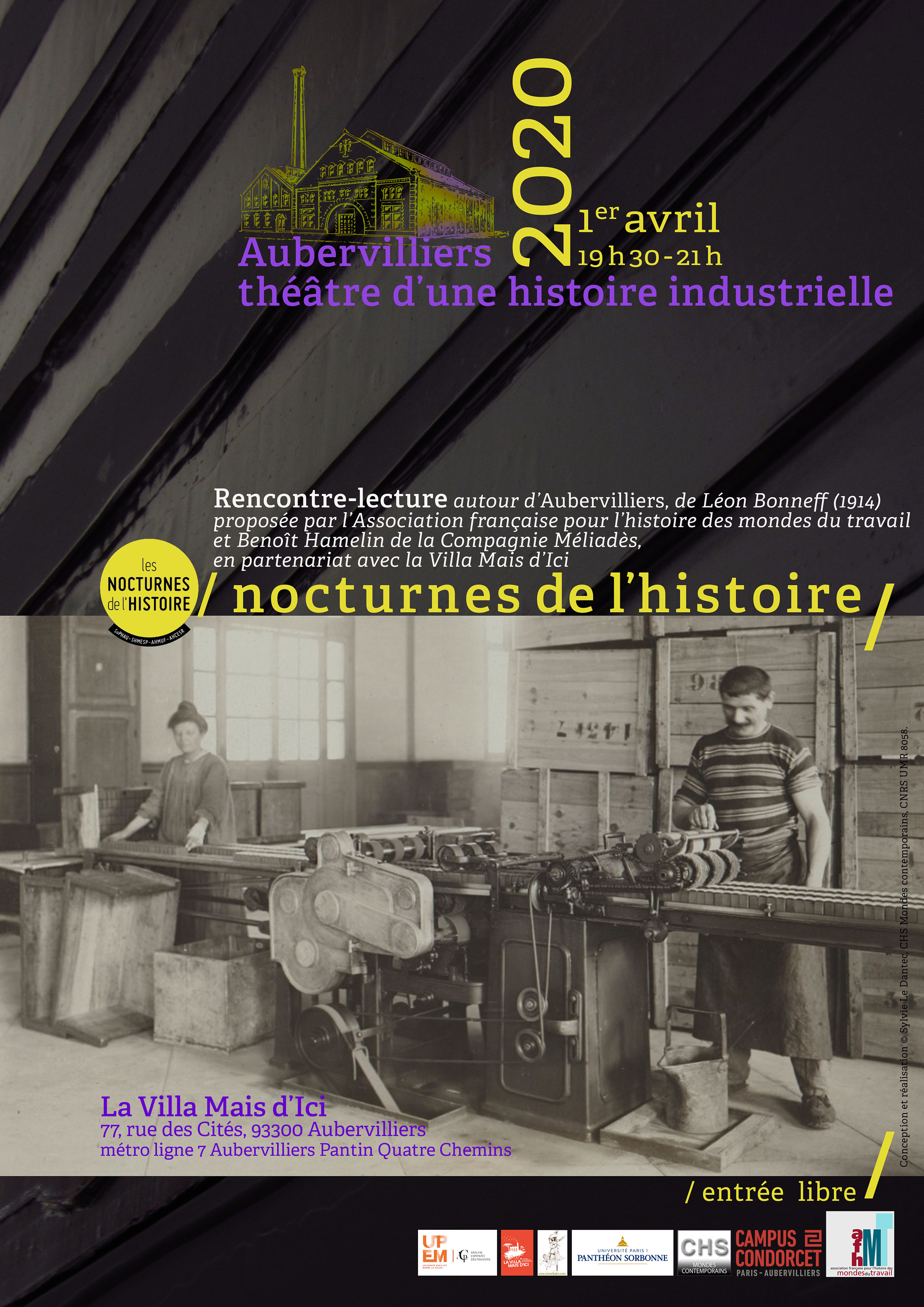 Les nocturnes de l’histoire proposent un spectacle inspiré de l’ouvrage Aubervilliers de l’écrivain Léon Bonneff paru en 1914 auquel contribue de nombreux invités ainsi que des comédiens et étudiants. Le public sera également invité à réagir, participer et raconter des souvenirs du « vieil » Aubervilliers.